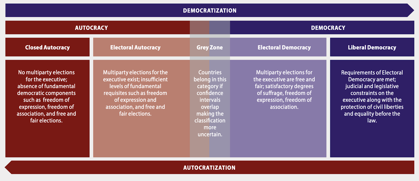 • Two dimensions: Competition and participation with eight institutional guarantees (Dahl, 1971)
